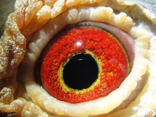 格友會反問,一些烏漆嬤黑的鴿眼不是一樣入賞?我想眼前的烏漆嬤黑是表面的,當你手持20倍放大鏡仔細觀察,你會發現這種黑是黑的透亮、黑的勻稱,更重要的是,這種可以入賞的黑眼,可不是用黑眼配黑眼生出來的,同結構的黃眼或紅眼互配,都能生出黑眼來。