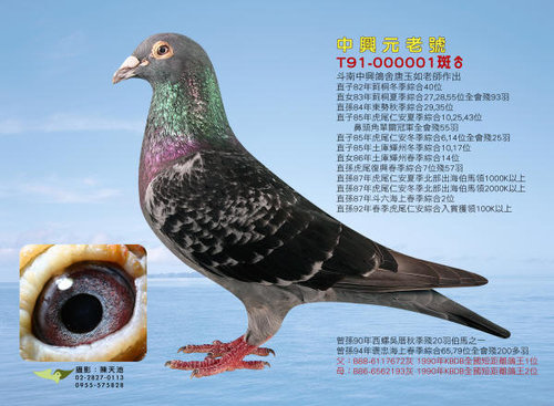 直系入賞眾多不計其數持續發揮中................. 父B88-6117672 灰入賞1990年KBDB全國短距離鴿王1位 母B86-6562193 灰入賞1990年KBDB全國短距離鴿王2位 中興元老號T91-000001斑公: 比利時KBDB全國短距離鴿王1位&2位 直子入賞2/7/10/14/17/21...等多羽 直孫T04-619742斑公入賞93年夏季海翔二崙油車支會五關綜合35位 直孫女為C98-119456銀母入賞1998年斗六賽鴿支會春季海上綜合2位全會殘24羽斗六市林叔雄使翔 曾孫子(C98-119456銀母直子)C01-178527 紅公2001年入賞西螺吳厝支會秋季五關全會殘20羽之一 中興元老號直子:C01-148450 紅斑公 中興元老號家族 特留育種鴿全兄弟姐妹入賞甚多............. ※歡迎引進本舍得獎入賞同線血源銘鴿